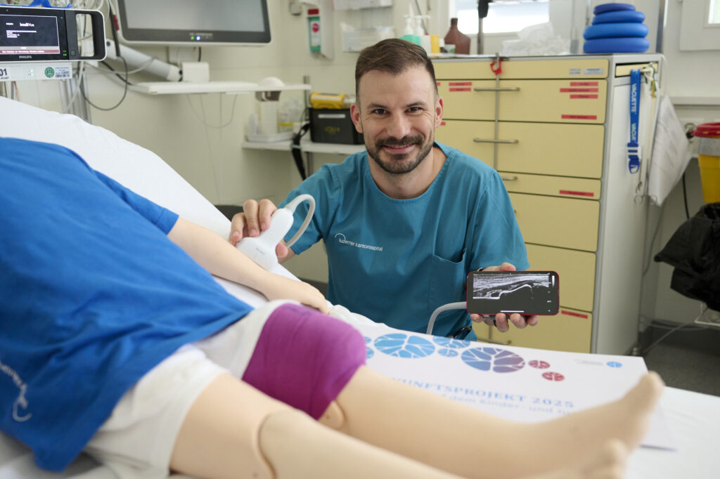 Dr. med. David Troxler, Oberarzt am Kinder- und Jugendnotfall (KJNO) des Kinderspitals Zentralschweiz, testet ein tragbares Ultraschallgerät im klinischen Alltag. Es liefert innerhalb von zwei Minuten präzise Bilder, etwa bei Lungenentzündung oder Flüssigkeitsmangel. Diagnosen erfolgen früher, Behandlungen gezielter – mit positiven Effekten für alle Beteiligten.